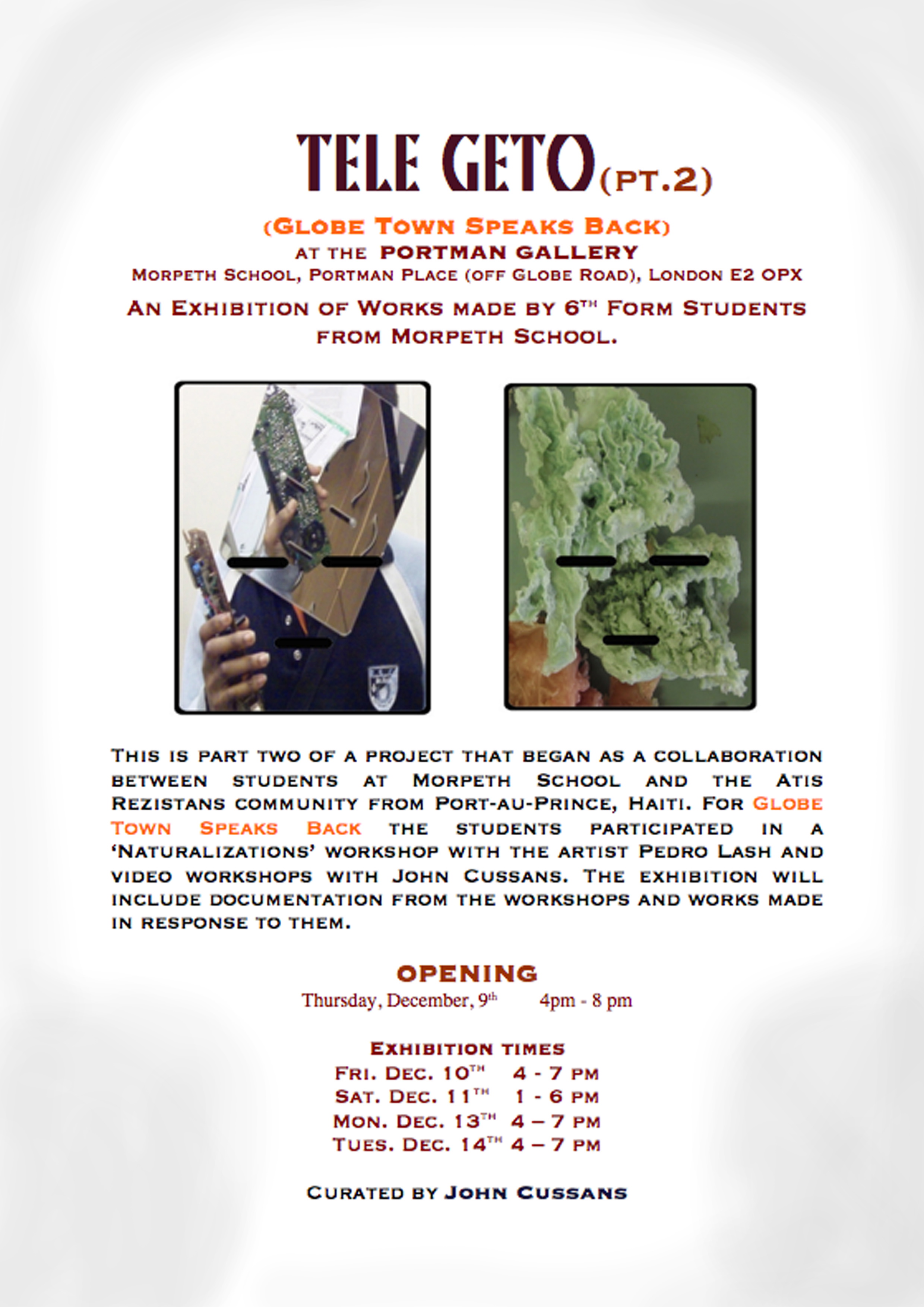 The name Tele Geto derives from an artwork created by young people from the Atis Rezistans community of Grand Rue, Port-au-Prince (Ti Moun Rezistans) during the Ghetto Biennale which took place there in December 2009. Three weeks after the Biennale Haiti was devastated by a catastrophic earthquake that left hundreds of thousands of people dead and many more injured and homeless. In the wake of the disaster I sent a camera and microphone to Ti Moun Rezistans so that they could start making films about their lives after the quake which could be shown on the internet. At this same time I was approached by Andrew Cooper from the Portman Gallery to curate a show with students from Morpeth School.