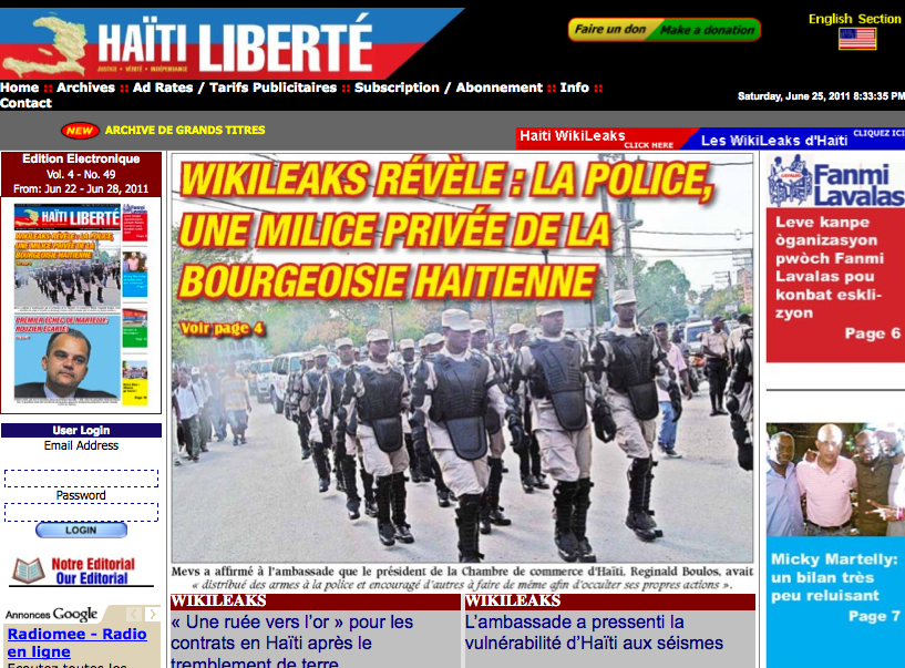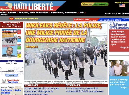 Here is a recent bulletin from Democracy Now in which Dan Coughlin and Haïti Liberté editor Kim Ives discuss recent US intervention in Haiti. It includes exposes about how the Haitian elite and business class tried to use Haiti’s police force as their own private armies after the ousting of President Aristide in 2004, how the US, the EU and the UN supported recent elections in full knowledge of the unfair exclusion of the Lavalas party, and how US contractors worked aggressively with the US Embassy to block a minimum wage increase for Haitian ‘assembly zone’ workers. Amy Goodman will be chairing the conversation between Julian Assange and Slavoj Žižek which will take place in London on July 2nd. This discussion will be broadcast at Democracy Now.