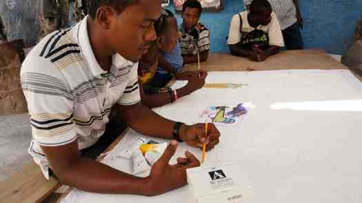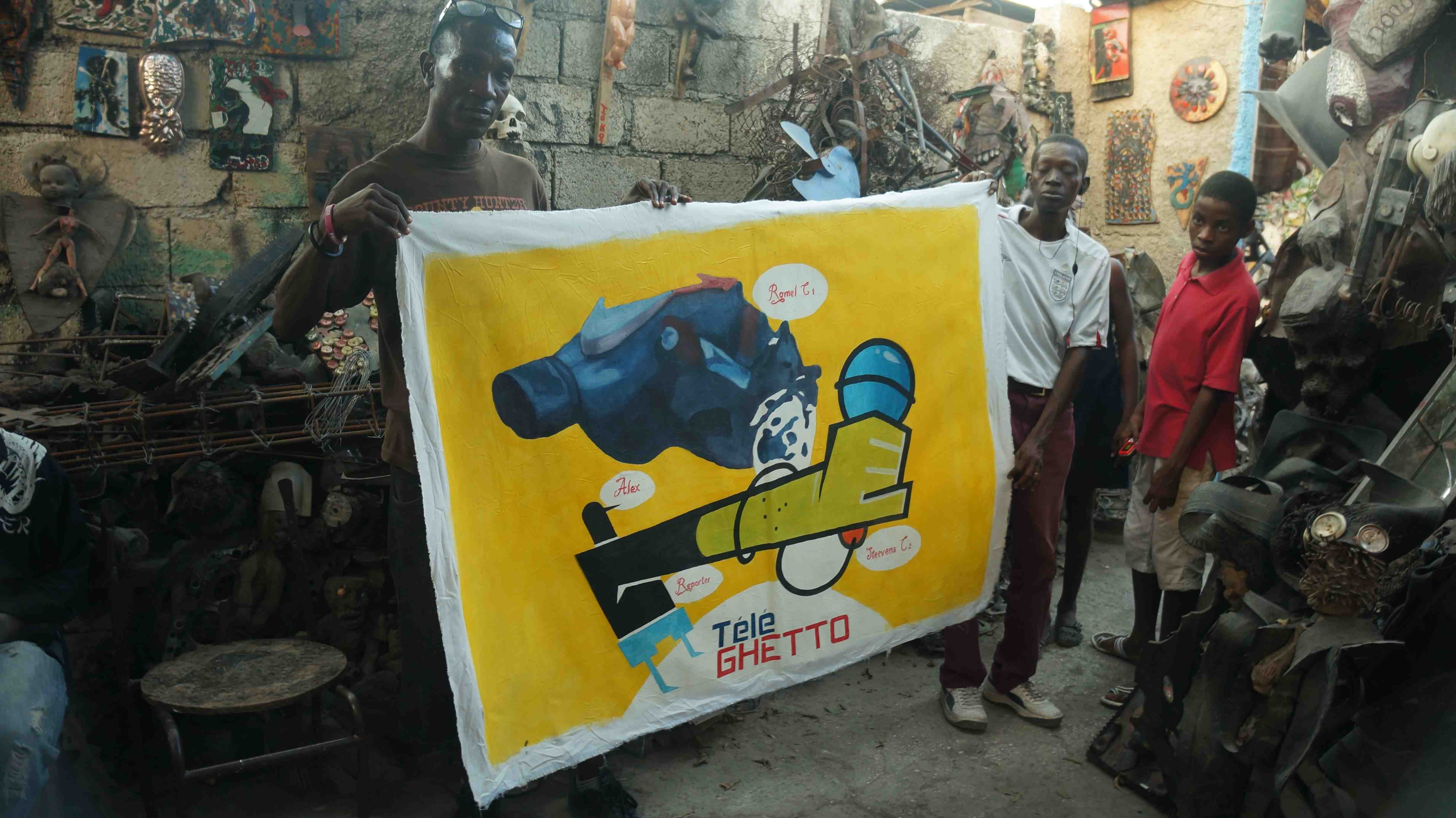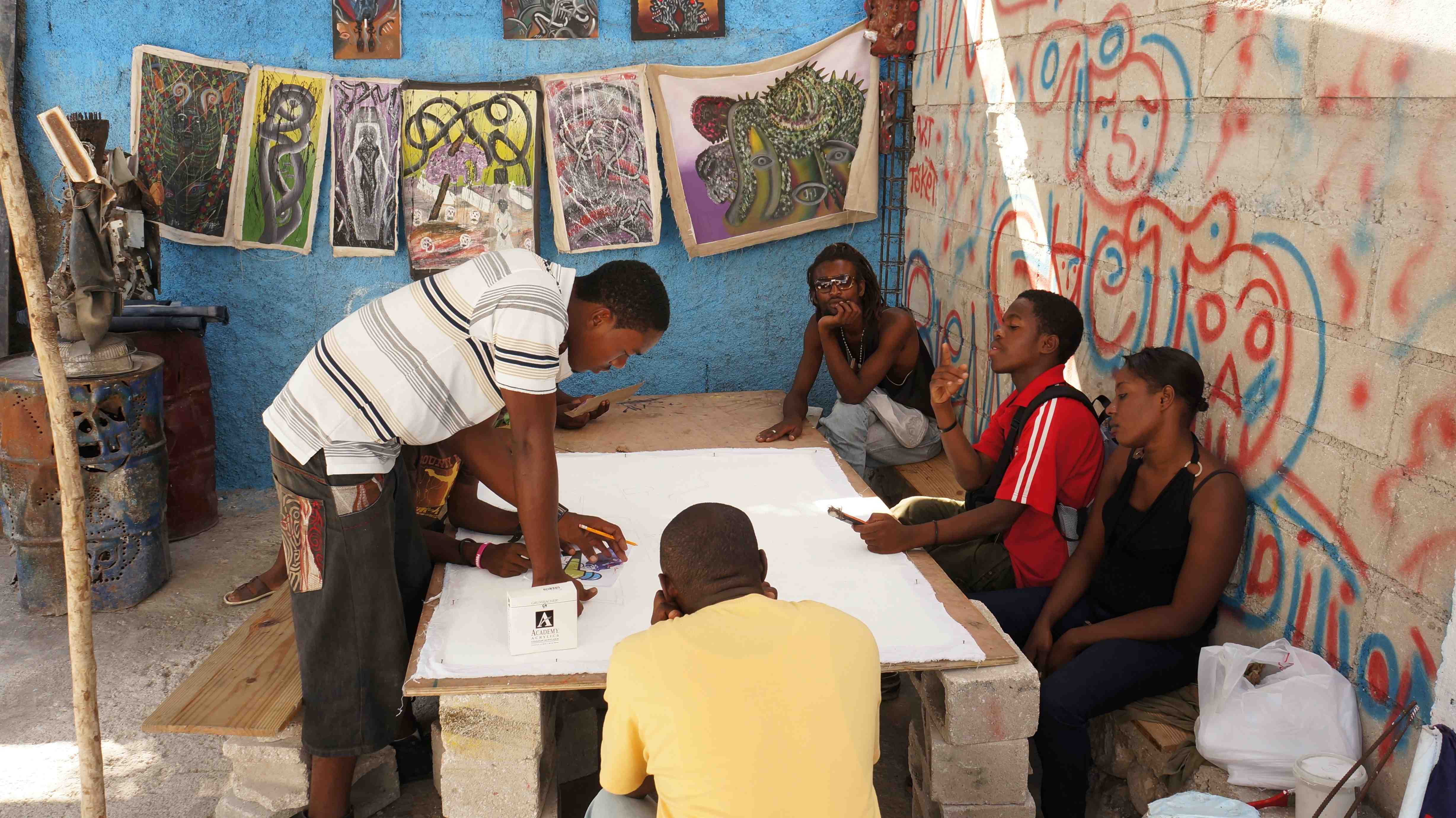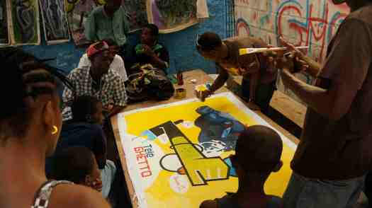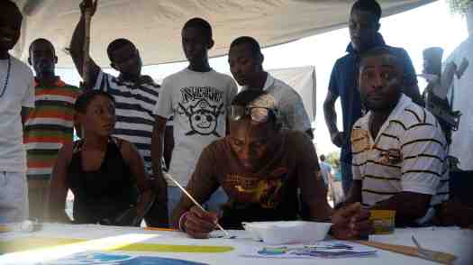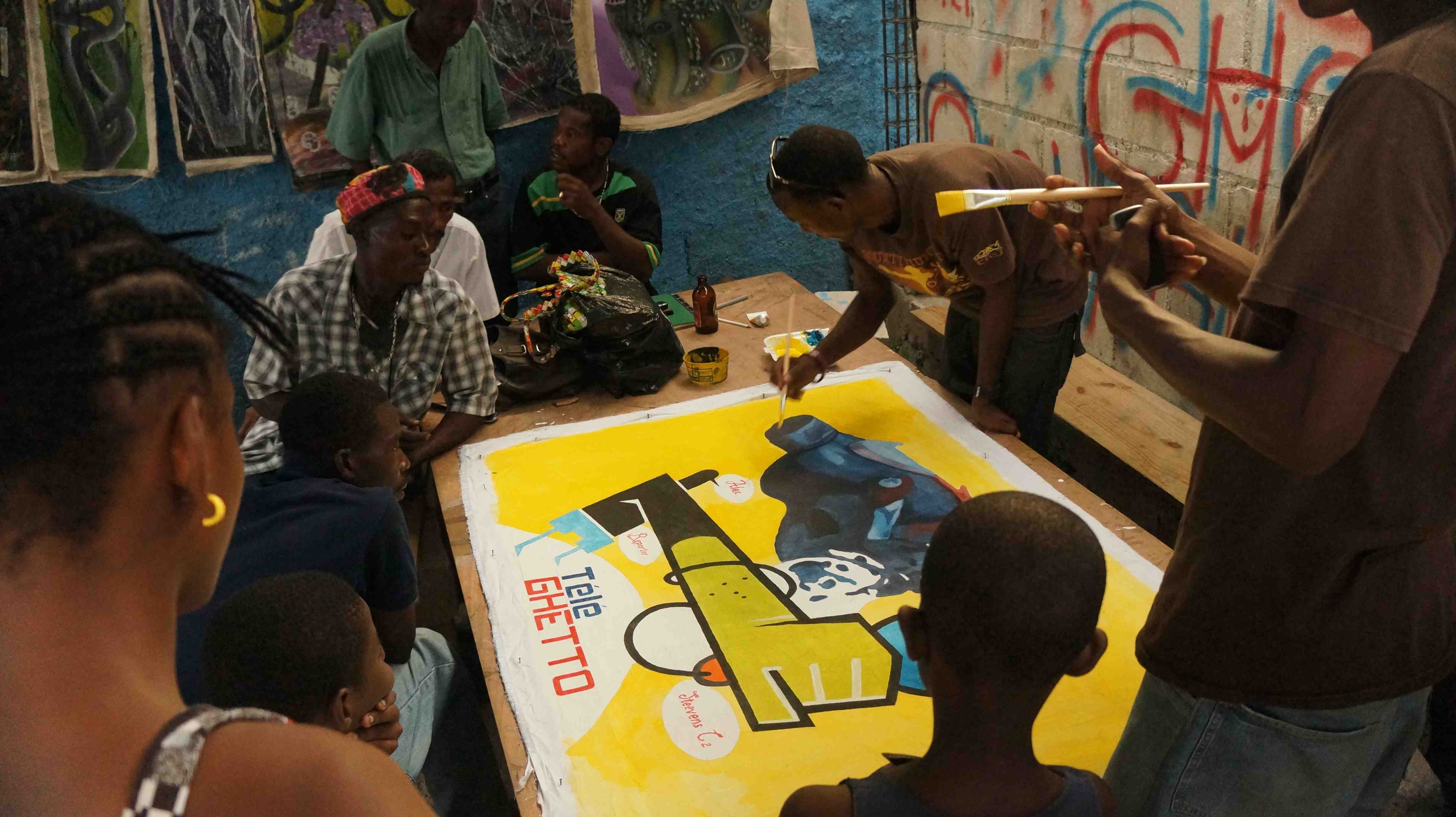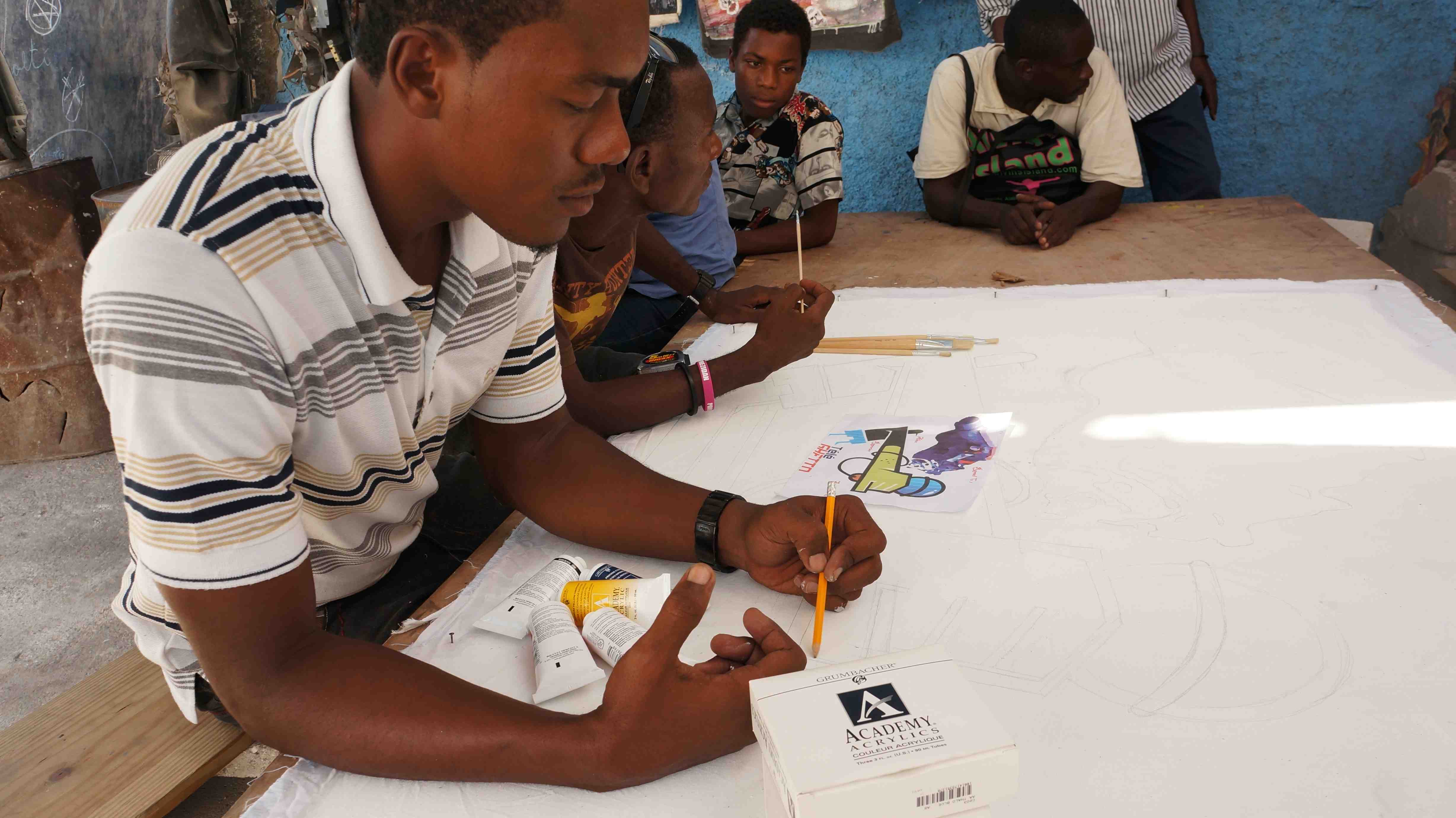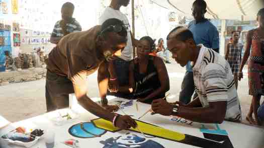 During the early negotiations about the painting for the tap tap it was proposed by Chevy that we should make the painting on vinyl so as not to damage the bonnet of Evel’s truck. The next day Michel and Joseph – the painters – suggested we make it on canvas so that after the biennale I can take the painting back to the UK. This is a brilliant solution. Alex printed off the new design he had made and the plan was to come back the next day to make the piece.