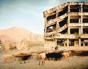 - Bullet-scarred apartment building and shops in the Karte Char district of Kabul – Photograph by Simon Norfolk