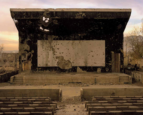 - Bullet-scarred outdoor cinema at the Palace of Culture in the Karte Char district of Kabul – Photograph by Simon Norfolk