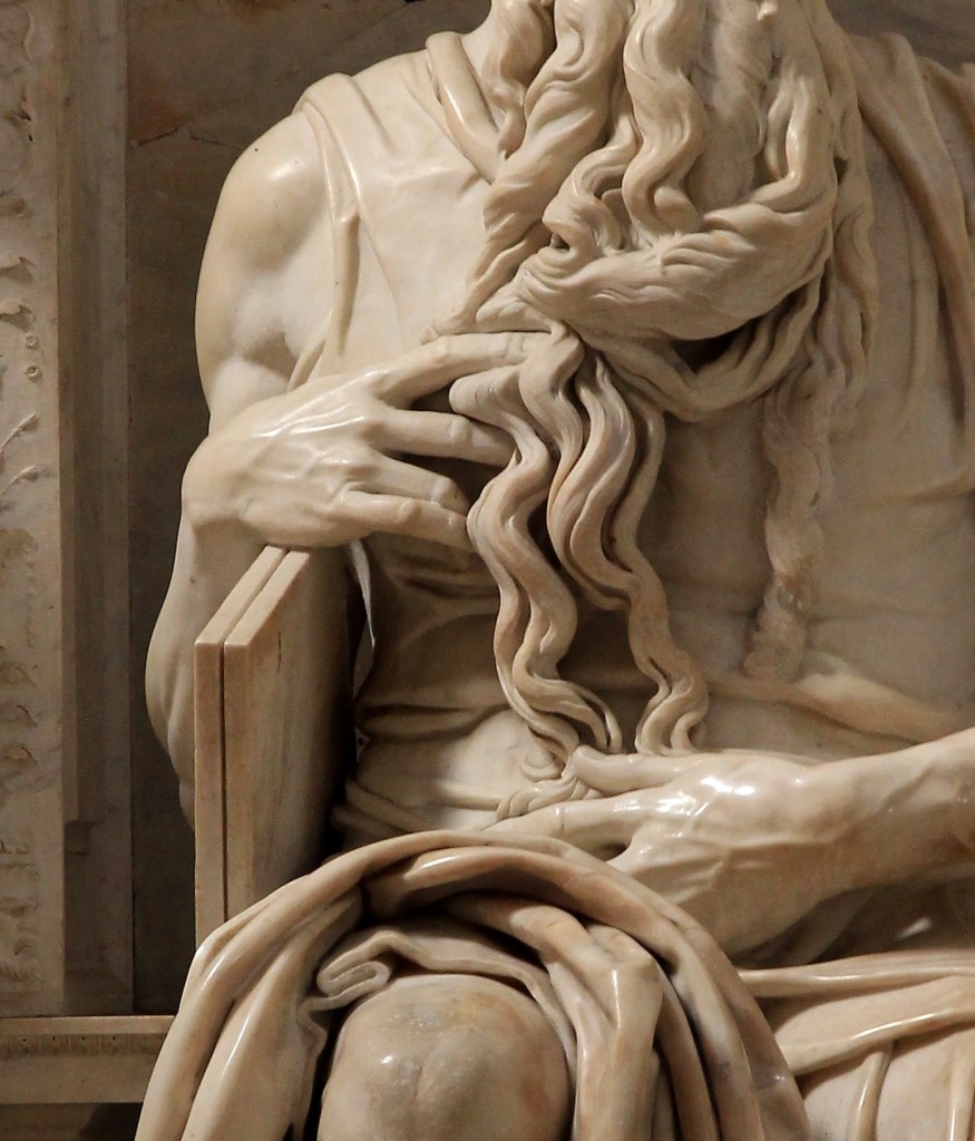 In the essay Freud focuses on details of the sculpture which have particular relevance for him (Moses’ posture, facial expression, the right hand which seems to be gently pulling his flowing beard to one-side, the instability of the tablets of the Ten Commandments which rest to his side) and how they have been interpreted by other scholars in relation to the biblical narrative it is assumed to depict. Most scholars assume the moment is when Moses, after descending from Mount Sinai with the tablets of Ten Commandments, is confronted by his followers worshiping the pagan idol of the Golden Calf and breaks the tablets in rage.[27] Freud makes a thorough overview of previous art historical interpretations of the sculpture and the meaning of each detail which come some way to explaining his fascination. But this only helps to partially help explain his fascination.
