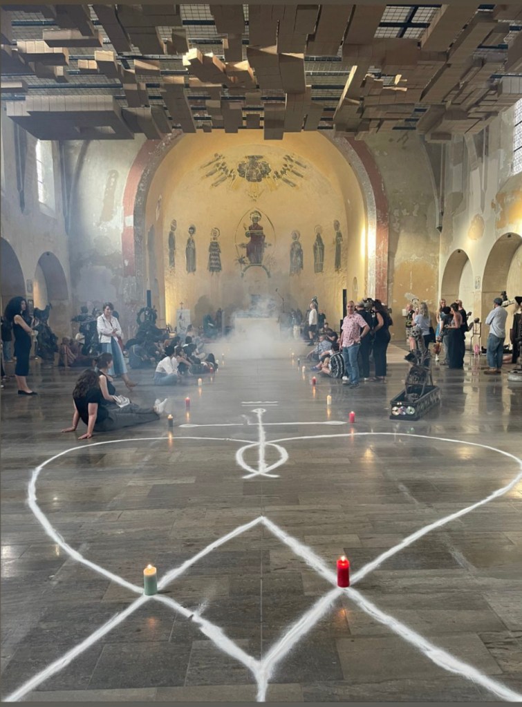 Veves are ritual diagrams drawn in powder during Haitian Vodou ceremonies that represent the cosmic signatures of the loa, the pantheon of Vodou spirits. Veve Kunigundis was designed to represent the patroness of the church in which Atis Rezistans and colleagues from the Ghetto Biennale were exhibiting.