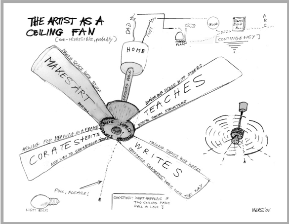 Adelheid Mers’ work The Artist as a Ceiling Fan represents the situation of contemporary artist as meta-practitioner operating across a range of practices that extend beyond the scope of traditional fine arts. Paraphrasing the art theorist Thierry De Duve in Kant After Duchamp (1998), the contemporary situation in which an artist can work in any medium, engage different social networks and take meaning from any discourse coincides with one where artists (with a capital A) can “Do Whatever”. What they might do as an Artist ranges from the specific techniques, skills and objects of traditional fine arts practices to anything “whatever”, so long as the person doing whatever identifies themselves in advance as an ‘Artist’. In this sense the self-constitution of the artist precedes the essence of the whatever that is done, and the art of the work is located not in the nature of the doing, or the quality of the product, but in the assumed identity of the do-er. Meanwhile a person highly skilled in a craft not traditionally recognised within the traditions of Fine Art (baking, football, gardening, teaching, surgery etc.) is not an artist in the Fine Art sense.