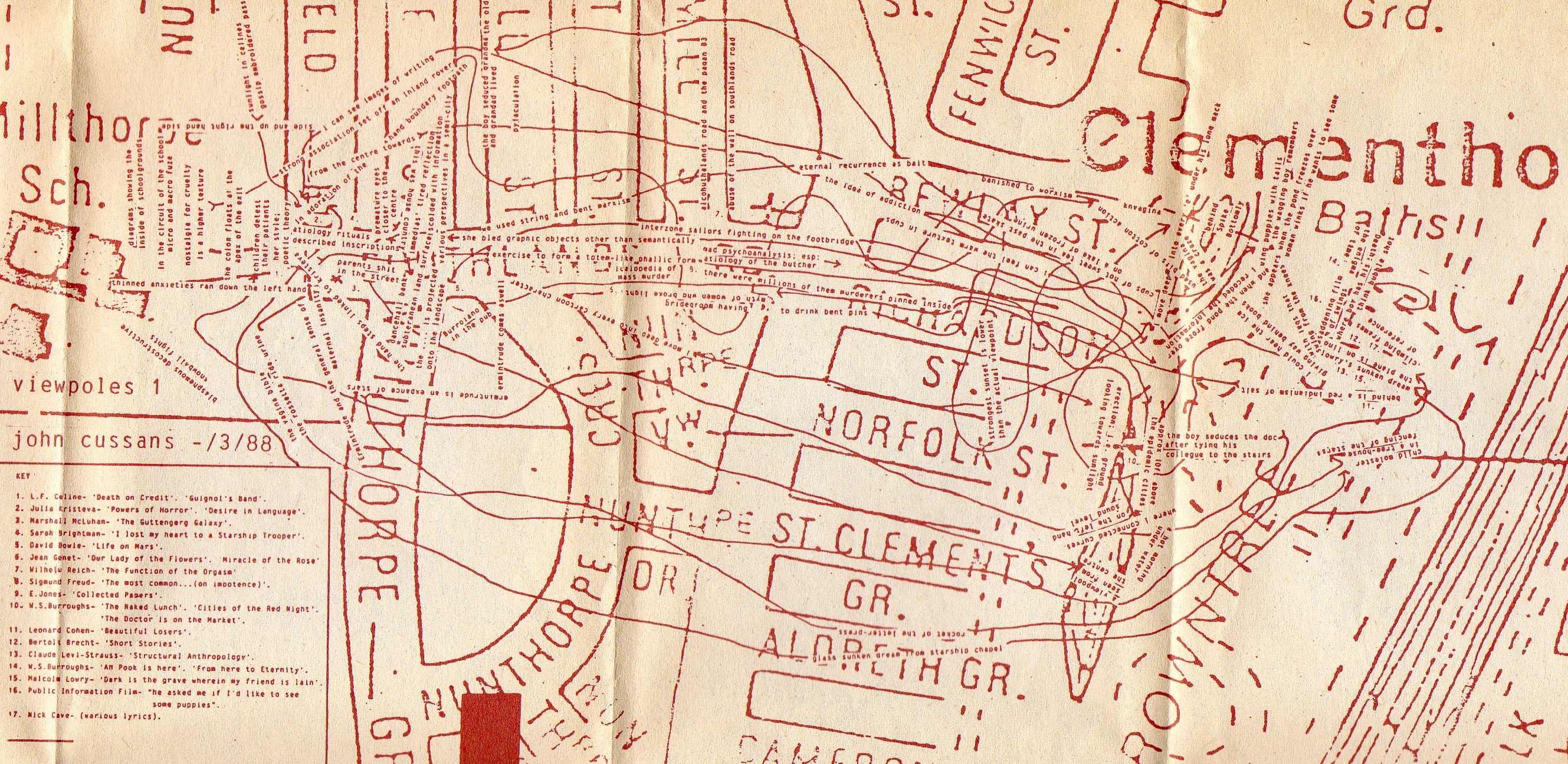 The control referred to in this ‘Map of Control’ is derived from the work of William S. Burrough’s who developed a unique notion of control as an alien, parasitic, word-image virus, which mentally imprisons its hosts (“humans, as you call them”) in carceral “reality studios”. The map shown here represents an inter-textual network of literal and philosophical links mapped on the memorial, psychic terrain of a municipal park in my home-town of York, upon which the network of associations about control had become involuntarily fixed in my mind as I dove deeper into Theory. I introduce this image not simply to illustrate my early attempts to combine theoretical diagramming with art-making and art-writing, but because Burroughs was a life-long practitioner of General Semantics, the didactic and diagrammatically-informed, teaching and thinking method, created by the mathematician Alfred Korzybski, that I will be discussing in part two.
