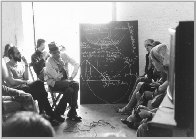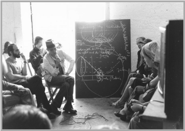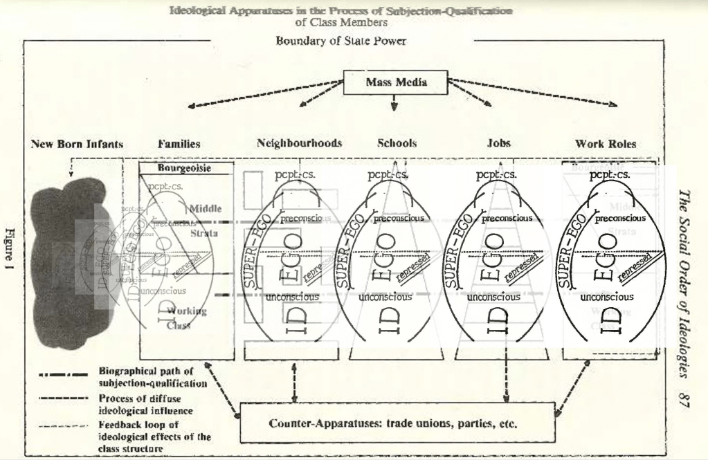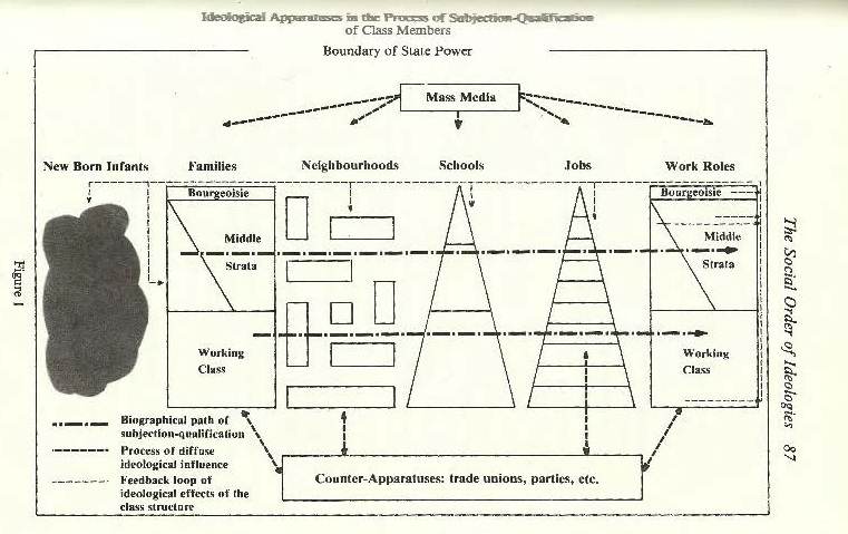 Althusser’s concepts of ideological and repressive state apparatuses suggest an imaginary plan of the complex system of interconnected institutions which produce humans as specific kinds of subjects – like Artists – through the coercive and formative action of institutionalized ideology and, if necessary, violence. In this sense we can see how Althusser’s philosophy offers us a conception of a systemic diagram designed to produce compliant subjects for the reproduction of capitalist relations of production.
