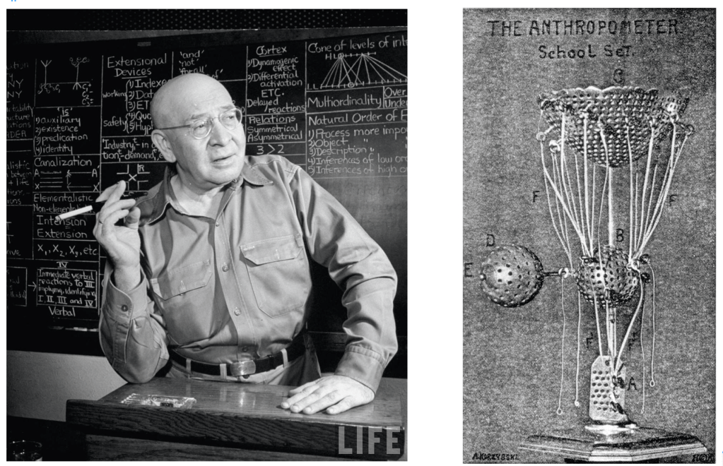 The device on the right, sometimes called ‘the Structural Differential’, sometimes ‘the Anthropometer’, is a four-dimensional, diagrammatic teaching device that Korzybski invented in 1923 in order to tangibly demonstrate to his colleagues at The New School of Social Research his thesis that humans do things differently to animals. In the second part of this presentation I will discuss the value of this diagram for art and design education, particularly for helping students distinguish between different levels of logical abstraction that human communication traverses; the importance of being precise about what level we are operating on; and the value, for clear thinking and communication, of precise definitions of the terms we are using to label and identify things – things like diagrams.
