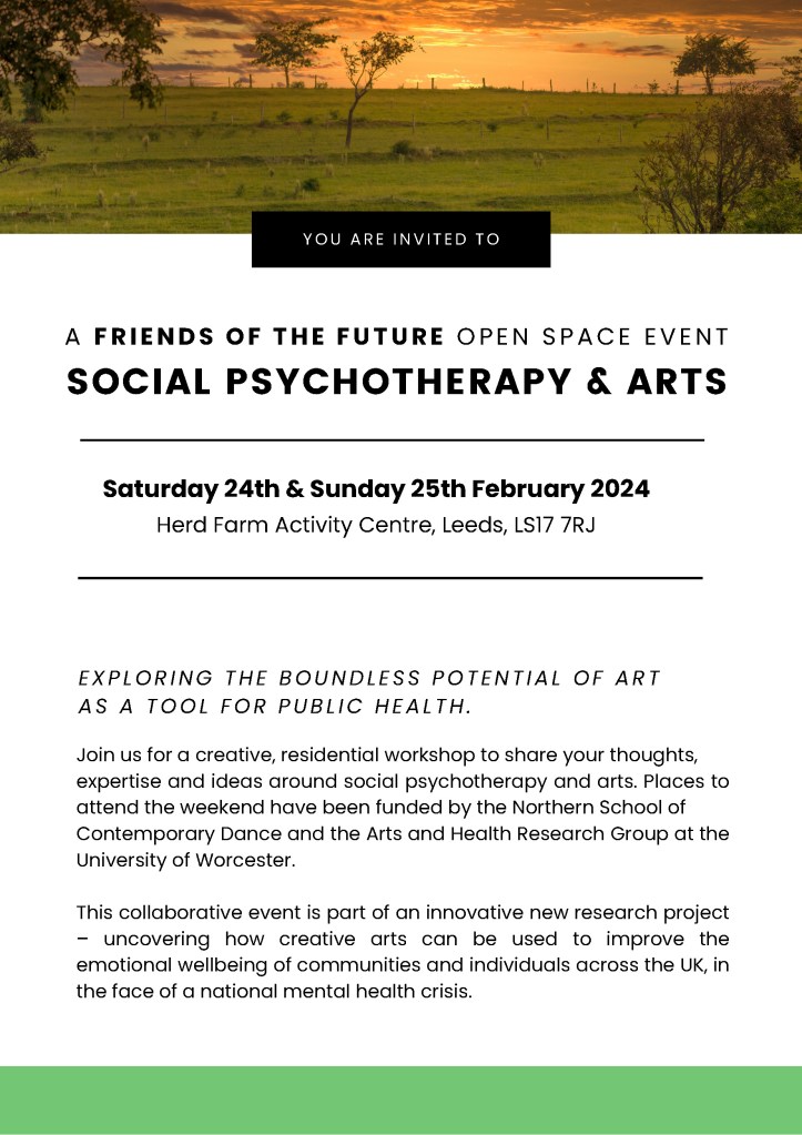 Along with colleagues from Friends of the Future and the Arts and Health Research Group at the University of Worcester, I’ve coordinated an Open Space event at Herd Farm in Leeds on the 24th and 25th Feb that will respond to the following prompts: