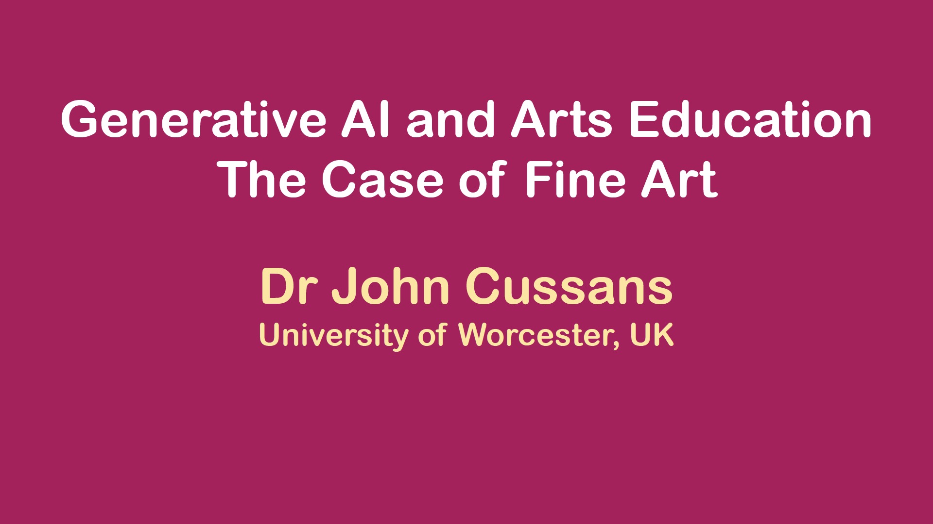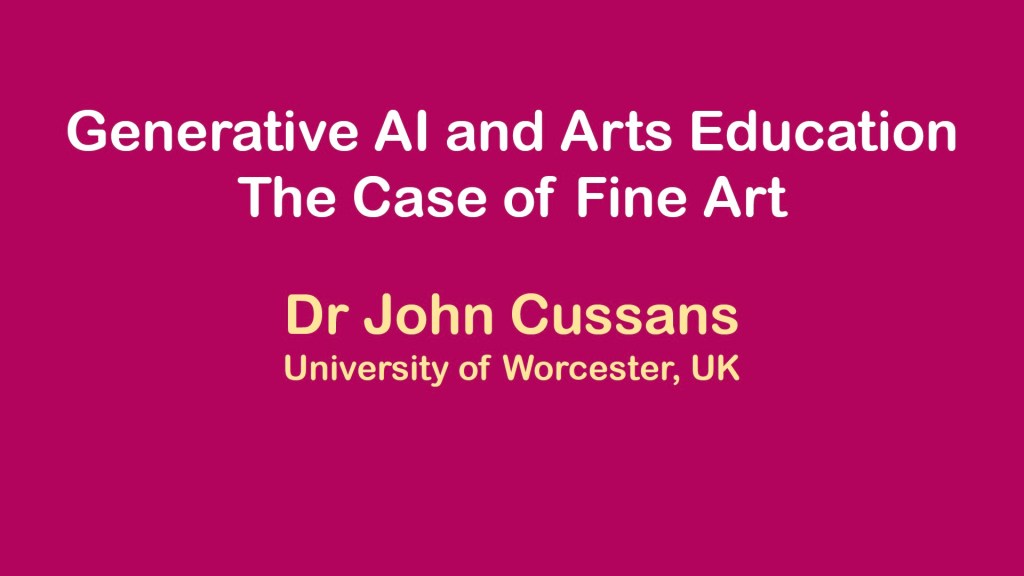 Thanks to Aspasia and Theo for all their hard work organising the conference and for inviting me to speak. Thanks also to the Benaki Museum for hosting such a timely and important debate. I will be speaking as an artist, writer and arts educator who has taught fine art studio practice and contextual studies for many years. I currently run the BA Fine Art and BA Fine Art with Psychology at the University of Worcester where I also lead the Arts and Health Research Group. I won’t be speaking about the latter today, but it informs my perspective on the impacts of generative AI tools on arts education and creativity more generally, particularly in relation to the mental and physical health effects of ubiquitous computing and on-line media environments within which generative AI developed and operates.